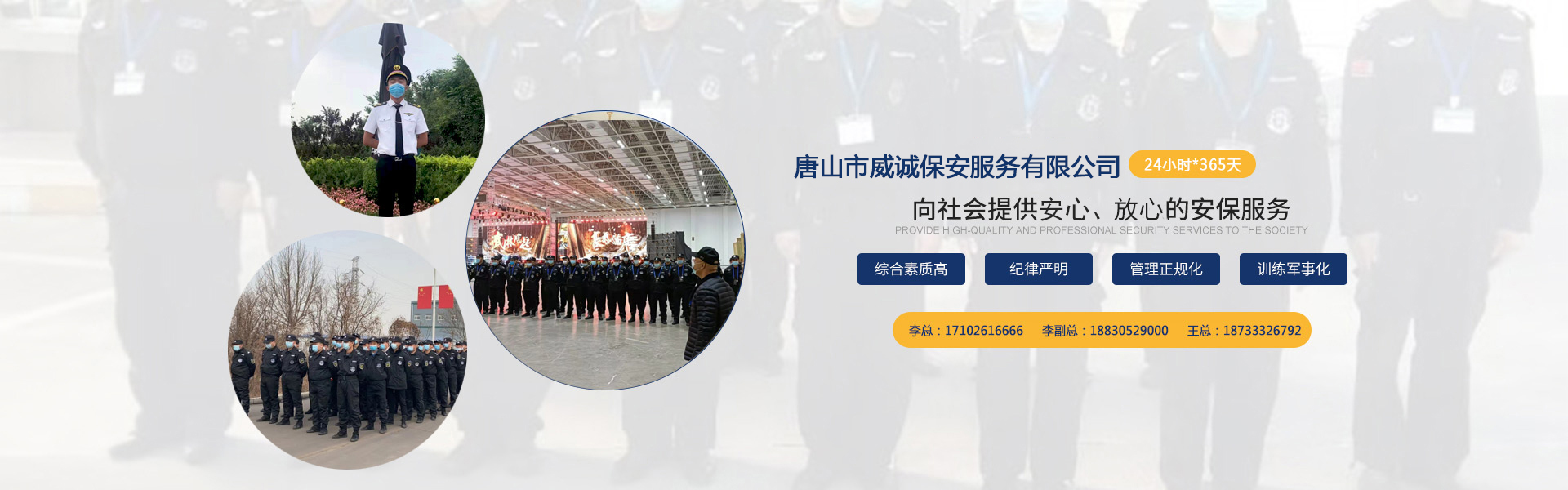 唐山市威誠(chéng)保安服務(wù)有限公司自成立以來(lái)以“嚴(yán)防死守、忠于業(yè)主”為服務(wù)原則,以“客戶滿意、 合作共贏”為根本目標(biāo)。以科學(xué)的管理、多方位多層次的服務(wù),建立了首問(wèn)責(zé)任制,完善了走訪、回訪 、滿意度調(diào)查、末位淘汰的預(yù)警管理,不斷提高服務(wù)質(zhì)量,提高業(yè)主滿意度,提高企業(yè)形象。秉承“誠(chéng) 實(shí)守信,紀(jì)律嚴(yán)明,團(tuán)結(jié)協(xié)作,致精致誠(chéng)”的服務(wù)理念,為客戶提供高品質(zhì)、多方位、專(zhuān)業(yè)化的保安服務(wù)。 本公司制定了嚴(yán)謹(jǐn)?shù)亩ㄏ蛘猩徢芭嘤?xùn)、考核錄用、崗中培訓(xùn)、持續(xù)培訓(xùn)、末位淘汰制等一整套完善的管理體系。可以根據(jù)客戶的要求實(shí)地勘察評(píng)估,以量身定做的方式提供安保防范服務(wù)。